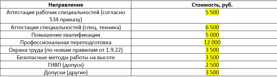 Цены на профессии учебного центра: